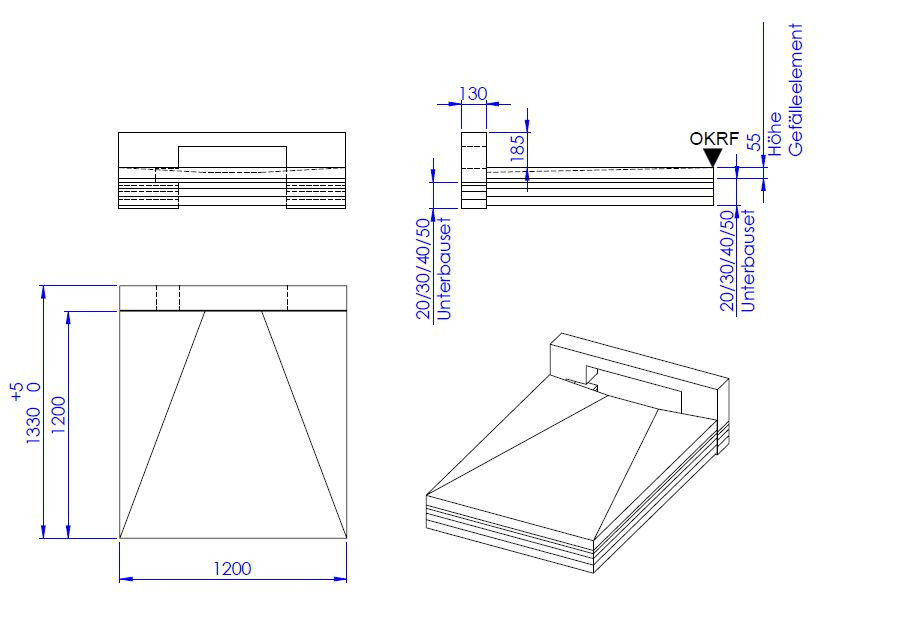 bodeneben, verfliesbar, barrierefrei (Fliesengröße bei Rollstuhlnutzung= 5 x 5 cm), bestehend aus Hartschaum-Gefälleelement mit integriertem Systemgefälle von ca. 2 %, werkseitig abgedichtet nach DIN 18534-1, Wassereinwirkungsklasse W2-I, Unterbauelemente (2/3/4/5 cm) zum Höhenausgleich auf der Baustelle, Adapter