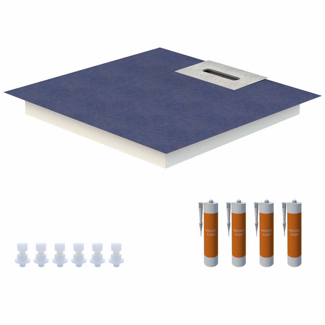 Systemduschelement für die lineare Entwässerung auf der Belagsebene, Gefälleelement mit werkseitig eingearbeitetem Gefälle von ca. 2 %, werkseitig aufgebrachte Vliesabdichtung nach DIN 18534-1, Wassereinwirkungsklasse W2-I, integriertes Ablaufgehäuse aus ABS mit Geruchsverschluss, Ablaufstutzen DN 50 Richtung Raumseite zum einfachen Anschluss an die HT-Entwässerung, mit zweiter Ablaufebene, Sekundärentwässerung, Sperrwasserhöhe 50 mm, Ablaufleistung 0,8 l/s bei 20 mm Anstauung, Unterbauelement quadroU zum Höhenausgleich auf der Baustelle, mit 6er Set Stellfüße und Montagekleber