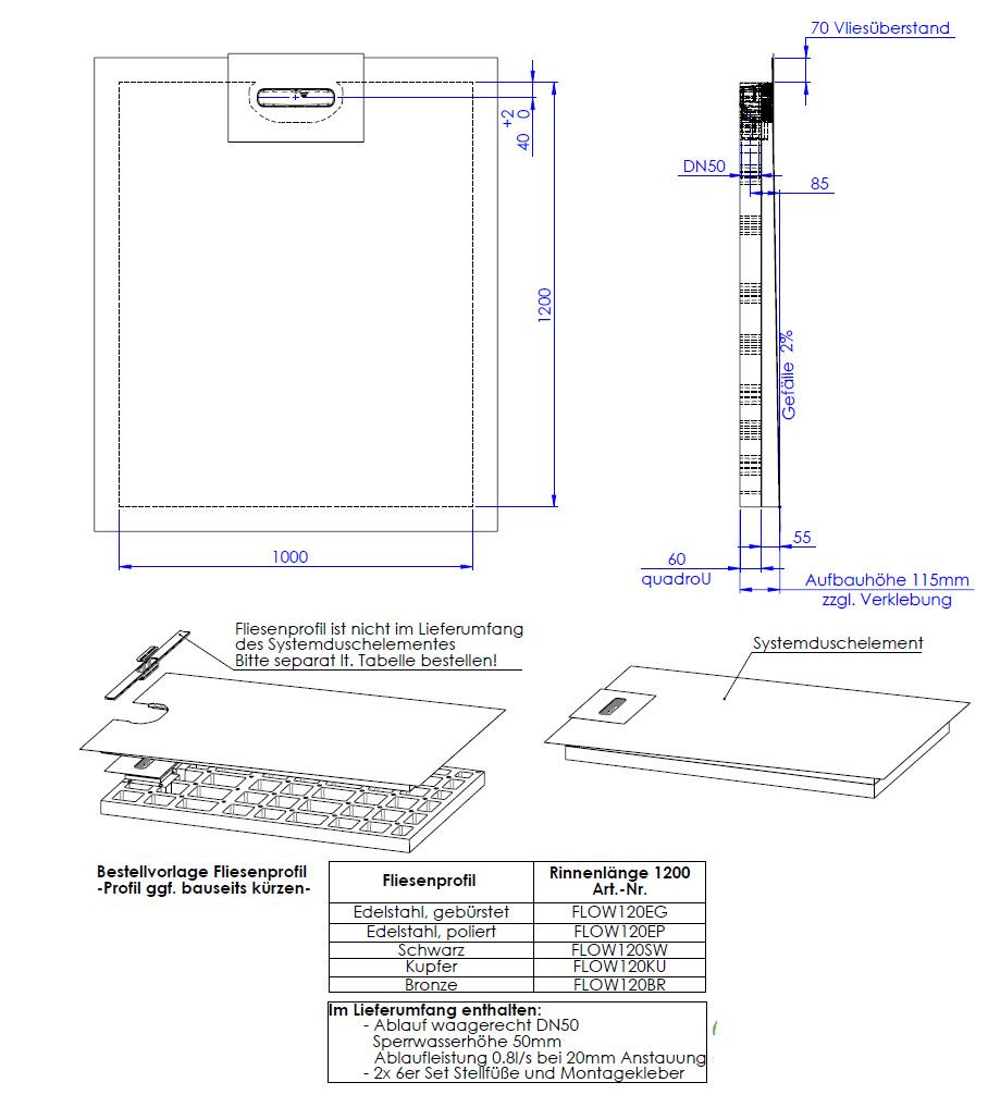 Systemduschelement für die lineare Entwässerung auf der Belagsebene, Gefälleelement mit werkseitig eingearbeitetem Gefälle von ca. 2 %, werkseitig aufgebrachte Vliesabdichtung nach DIN 18534-1, Wassereinwirkungsklasse W2-I, integriertes Ablaufgehäuse aus ABS mit Geruchsverschluss, Ablaufstutzen DN 50 Richtung Raumseite zum einfachen Anschluss an die HT-Entwässerung, mit zweiter Ablaufebene, Sekundärentwässerung, Sperrwasserhöhe 50 mm, Ablaufleistung 0,8 l/s bei 20 mm Anstauung, Unterbauelement quadroU zum Höhenausgleich auf der Baustelle, mit 6er Set Stellfüße und Montagekleber