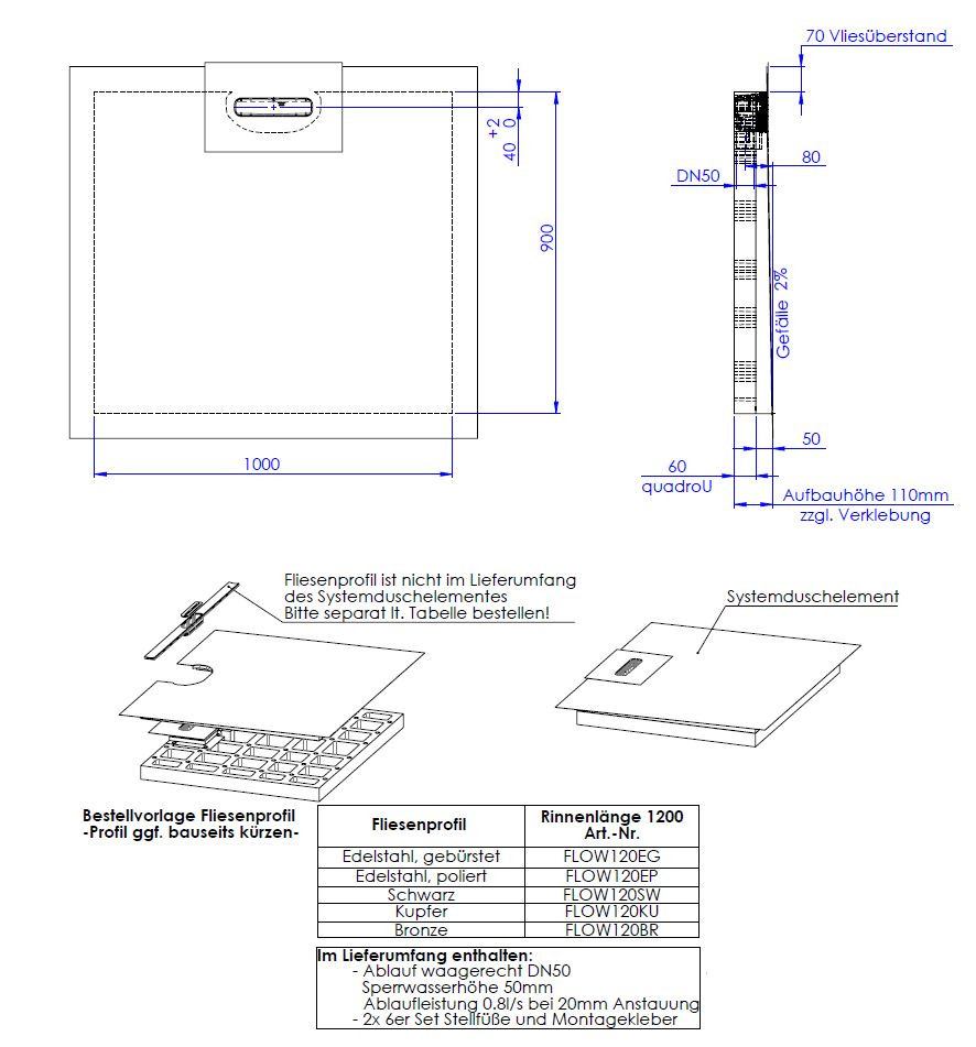 Systemduschelement für die lineare Entwässerung auf der Belagsebene, Gefälleelement mit werkseitig eingearbeitetem Gefälle von ca. 2 %, werkseitig aufgebrachte Vliesabdichtung nach DIN 18534-1, Wassereinwirkungsklasse W2-I, integriertes Ablaufgehäuse aus ABS mit Geruchsverschluss, Ablaufstutzen DN 50 Richtung Raumseite zum einfachen Anschluss an die HT-Entwässerung, mit zweiter Ablaufebene, Sekundärentwässerung, Sperrwasserhöhe 50 mm, Ablaufleistung 0,8 l/s bei 20 mm Anstauung, Unterbauelement quadroU zum Höhenausgleich auf der Baustelle, mit 6er Set Stellfüße und Montagekleber