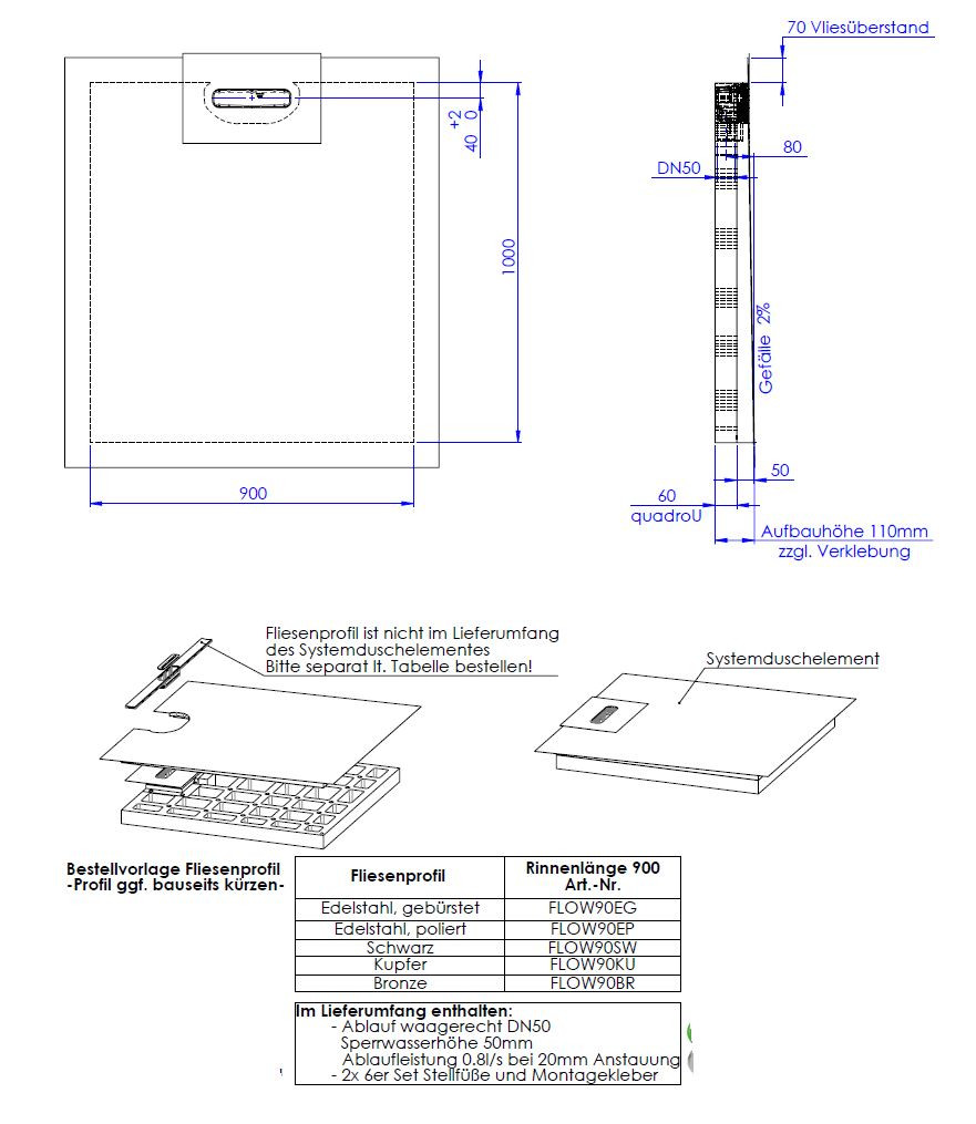 Systemduschelement für die lineare Entwässerung auf der Belagsebene, Gefälleelement mit werkseitig eingearbeitetem Gefälle von ca. 2 %, werkseitig aufgebrachte Vliesabdichtung nach DIN 18534-1, Wassereinwirkungsklasse W2-I, integriertes Ablaufgehäuse aus ABS mit Geruchsverschluss, Ablaufstutzen DN 50 Richtung Raumseite zum einfachen Anschluss an die HT-Entwässerung, mit zweiter Ablaufebene, Sekundärentwässerung, Sperrwasserhöhe 50 mm, Ablaufleistung 0,8 l/s bei 20 mm Anstauung, Unterbauelement quadroU zum Höhenausgleich auf der Baustelle, mit 6er Set Stellfüße und Montagekleber