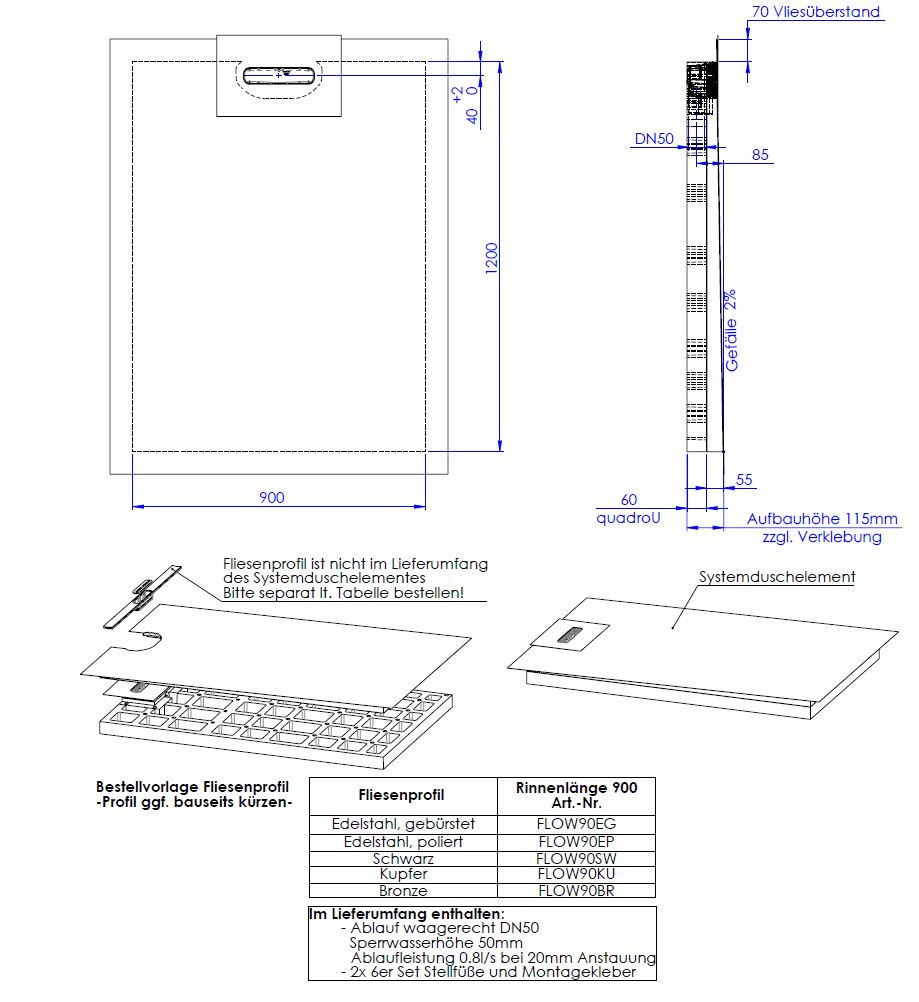 Systemduschelement für die lineare Entwässerung auf der Belagsebene, Gefälleelement mit werkseitig eingearbeitetem Gefälle von ca. 2 %, werkseitig aufgebrachte Vliesabdichtung nach DIN 18534-1, Wassereinwirkungsklasse W2-I, integriertes Ablaufgehäuse aus ABS mit Geruchsverschluss, Ablaufstutzen DN 50 Richtung Raumseite zum einfachen Anschluss an die HT-Entwässerung, mit zweiter Ablaufebene, Sekundärentwässerung, Sperrwasserhöhe 50 mm, Ablaufleistung 0,8 l/s bei 20 mm Anstauung, Unterbauelement quadroU zum Höhenausgleich auf der Baustelle, mit 6er Set Stellfüße und Montagekleber