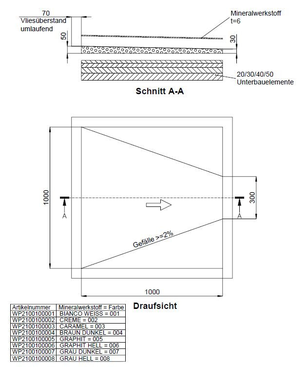 bodeneben, barrierefrei, mit Oberfläche aus Mineralwerkstoff 0,6 cm, rutschhemmend nach DIN 51097, Gruppe B, fugenlose Oberfläche zur bauseitigen Verklebung mit integriertem Gefälle von ca. 2 %, werkseitig aufgebrachte Vliesabdichtung mit Überstand 70 mm umlaufend nach DIN 18534-1, Wassereinwirkungsklasse W2-I, mit Unterbauelemente 2/3/4/5 cm, passend für GEBERIT Wandabläufe DUOFIX 111.581.00.1-DUOFIX 111.580.00.1-DUOFIX 111.589.00.1-DUOFIX 111.587.00.1, DUOFIX 111.593.00.1-DUOFIX 111.591.00.1 GIS 461.736.00.1-GIS 461.734.00.1-Sanbloc 440.736.00.1-Sanbloc 440.734.00.1, Kombifix 457.536.00.1-Kombifix 457.534.00.1