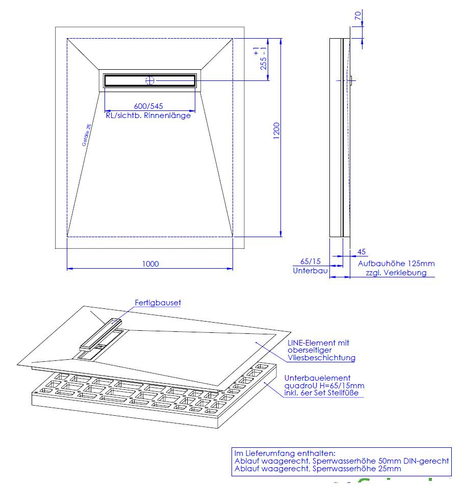 Gefälleelement mit werkseitig eingearbeitetem Gefälle von ca. 2 %, werkseitig aufgebrachte Vliesabdichtung nach DIN 18534-1, Wassereinwirkungsklasse W2-I, integrierte, eingedichtete SCHEDEL-Rinne mit Rahmen, höhenverstellbar 8-16 mm, optional Einleger für Natursteinrinne, bestehend aus standardmäßig mit DIN-gerechtem Ablauf waagerecht, Sperrwasserhöhe 50 mm und Ablauf waagerecht, Sperrwasserhöhe 25 mm, optional Ablauf senkrecht, mit zweiter Ablaufebene/Sekundärentwässerung, Ablauf mit Rinne verschraubbar, mit Unterbauelementeset quadroU 65/15 mm (mit 6er Set Stellfüße und Montagekleber) zum Höhenausgleich auf der Baustelle