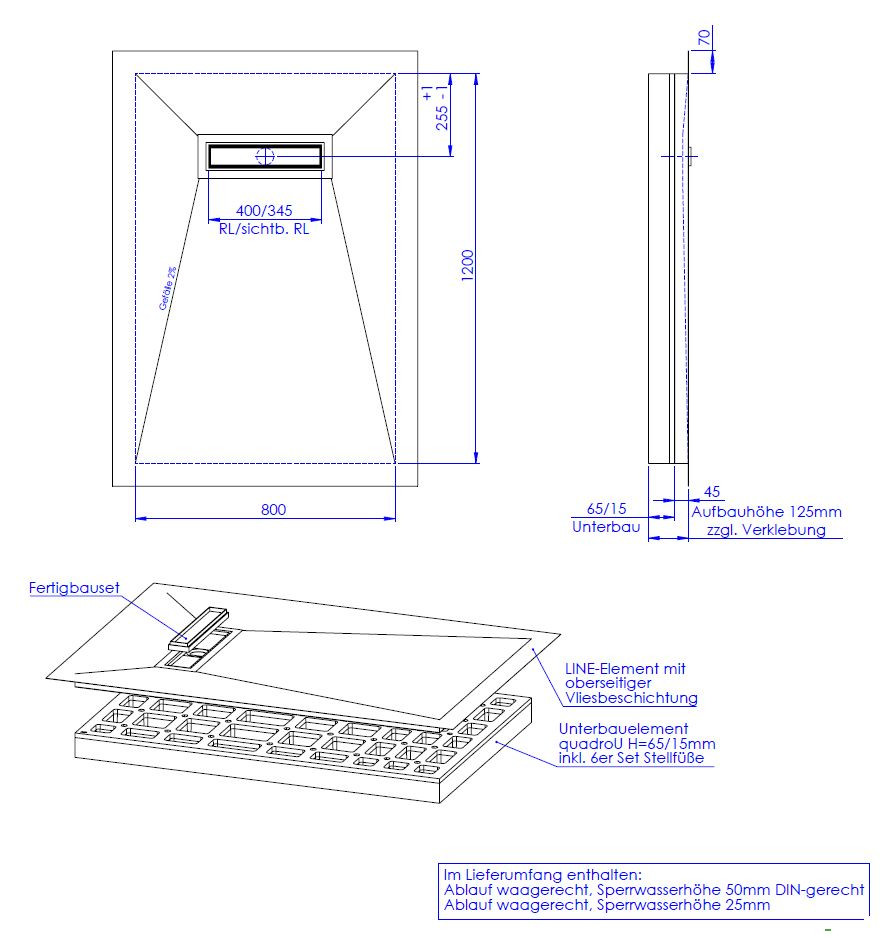 Gefälleelement mit werkseitig eingearbeitetem Gefälle von ca. 2 %, werkseitig aufgebrachte Vliesabdichtung nach DIN 18534-1, Wassereinwirkungsklasse W2-I, integrierte, eingedichtete SCHEDEL-Rinne mit Rahmen, höhenverstellbar 8-16 mm, optional Einleger für Natursteinrinne, bestehend aus standardmäßig mit DIN-gerechtem Ablauf waagerecht, Sperrwasserhöhe 50 mm und Ablauf waagerecht, Sperrwasserhöhe 25 mm, optional Ablauf senkrecht, mit zweiter Ablaufebene/Sekundärentwässerung, Ablauf mit Rinne verschraubbar, mit Unterbauelementeset quadroU 65/15 mm (mit 6er Set Stellfüße und Montagekleber) zum Höhenausgleich auf der Baustelle