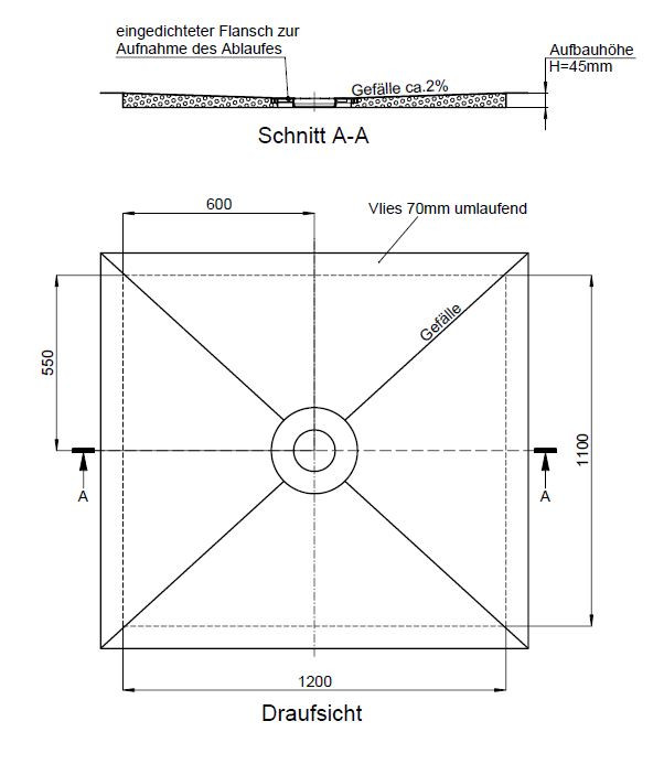 Hartschaum-PLAN-Element mit integriertem Gefälle von ca. 2 %, zur Punktentwässerung für KESSEL-Abläufe reversibel, Ablauf wählbar, werkseits abgedichtet nach DIN 18534-1, Wassereinwirkungsklasse W2-I, bodenbündig, verfliesbar, barrierefrei, Fliesengröße bei Rollstuhlnutzung >= 5 x 5 cm, umlaufend kürzbar, eingedichtete Flanschscheibe zur schraubbaren Montage des Ablaufgehäuses, geringe Aufbauhöhe, abhängig vom eingesetzten Ablauf, verschiedene Ablaufpositionen, hohe Ablaufleistung