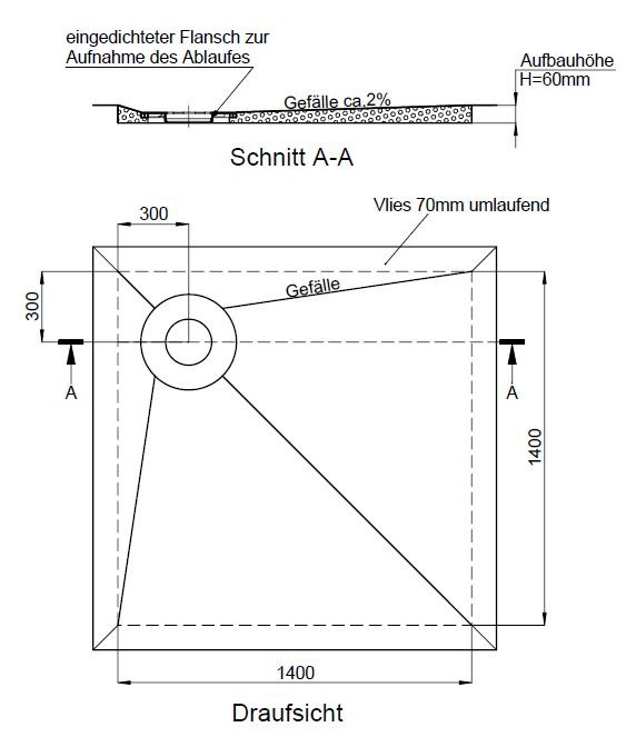 Hartschaum-PLAN-Element mit integriertem Gefälle von ca. 2 %, zur Punktentwässerung für KESSEL-Abläufe reversibel, Ablauf wählbar, werkseits abgedichtet nach DIN 18534-1, Wassereinwirkungsklasse W2-I, bodenbündig, verfliesbar, barrierefrei, Fliesengröße bei Rollstuhlnutzung >= 5 x 5 cm, umlaufend kürzbar, eingedichtete Flanschscheibe zur schraubbaren Montage des Ablaufgehäuses, geringe Aufbauhöhe, abhängig vom eingesetzten Ablauf, verschiedene Ablaufpositionen, hohe Ablaufleistung