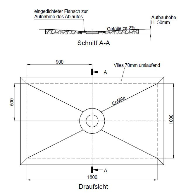 Hartschaum-PLAN-Element mit integriertem Gefälle von ca. 2 %, zur Punktentwässerung für KESSEL-Abläufe reversibel, Ablauf wählbar, werkseits abgedichtet nach DIN 18534-1, Wassereinwirkungsklasse W2-I, bodenbündig, verfliesbar, barrierefrei, Fliesengröße bei Rollstuhlnutzung >= 5 x 5 cm, umlaufend kürzbar, eingedichtete Flanschscheibe zur schraubbaren Montage des Ablaufgehäuses, geringe Aufbauhöhe, abhängig vom eingesetzten Ablauf, verschiedene Ablaufpositionen, hohe Ablaufleistung