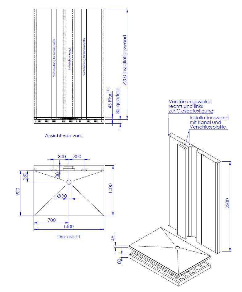 bestehend aus PLAN Plus - Hartschaum-System-Duschelement mit integriertem Gefälle, werkseitig abgedichtet, mit Design-Oberfläche aus Mineralwerkstoff, mit Installationsschacht für die Duscharmatur, fertig zum Befliesen, Unterbauelement quadroU, Systemduschwand, 100 mm tief, mit 6 Kartuschen Montagekleber