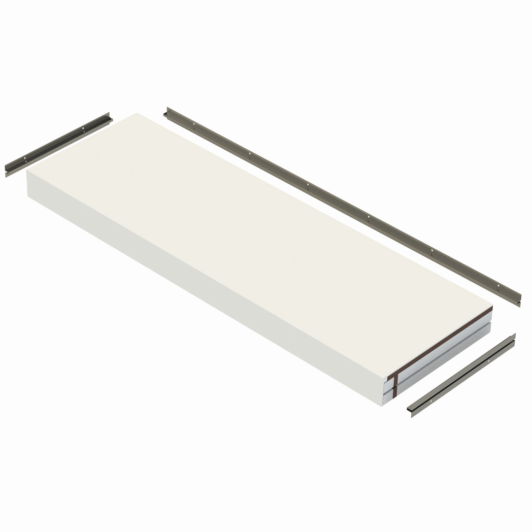 werkseitig verstärkte EPS-Trägerplatte mit front- und oberseitig aufgebrachter Designoberfläche aus Mineralwerkstoff in BIANCO WEISS, mit Vorbereitung für die Montage mit dem Systemmontagezubehör, mit Systemmontagezubehör für die Längs- und Seitenbefestigung, mit 1 Kartusche Montagekleber