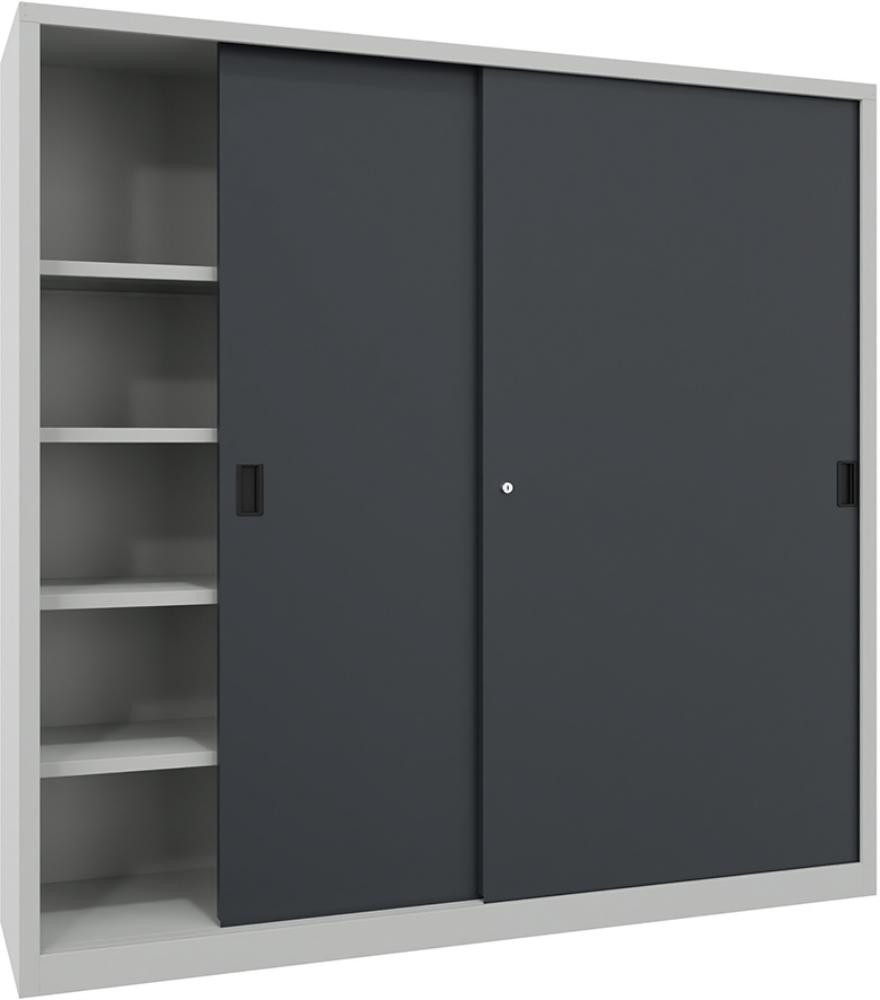Schwerlastschiebetürenschrank, mit Vollblechtüren und Mitteltrennwand, Böden gepulvert