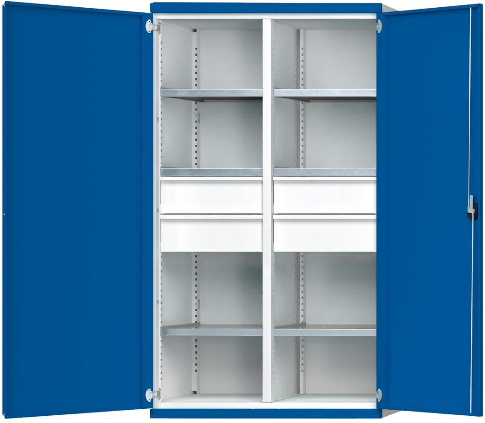 Schwerlastschrank B1085xT690xH1950mm RAL7035/5010 m.Mittelwand 6Böden,4Schubladen 200kg