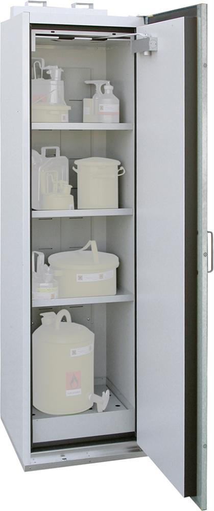 Hinweis: Zugelassen zur Lagerung entzündbarer Flüssigkeiten am Arbeitsplatz nach DIN EN 14470-1 (Typ 90) und TRGS 510, Anlage 3. Geprüfte und zugelassene Gesamtkonstruktion durch anerkannte Materialprüfanstalt nach DIN EN 14470-1 (Typ 90) mit einer Feuerwiderstandsfähigkeit von > 90 Minuten.