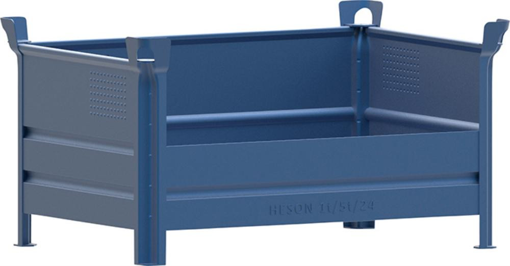 Stapelbehälter RAL5010 B1200xT800xH600 mm Nutzlast 1t Auflast 5t 1 Längsseite halb hoch