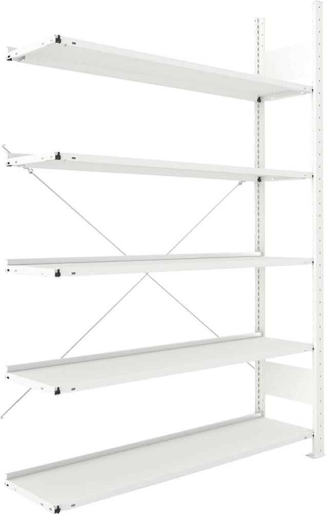 Anbauregal: 1 Rahmen mit Stahlfüßen, Fachböden (gemäß Tabelle) und Montagezubehör.