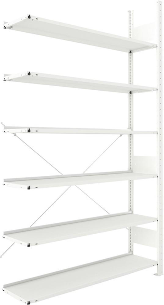 Anbauregal: 1 Rahmen mit Stahlfüßen, Fachböden (gemäß Tabelle) und Montagezubehör.