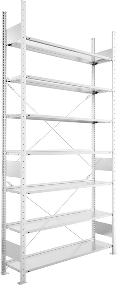 Anbauregal: 1 Rahmen mit Stahlfüßen, Fachböden (gemäß Tabelle) und Montagezubehör.