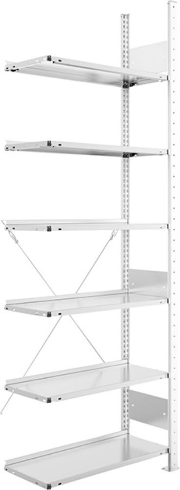 Anbauregal: 1 Rahmen mit Stahlfüßen, Fachböden (gemäß Tabelle) und Montagezubehör.
