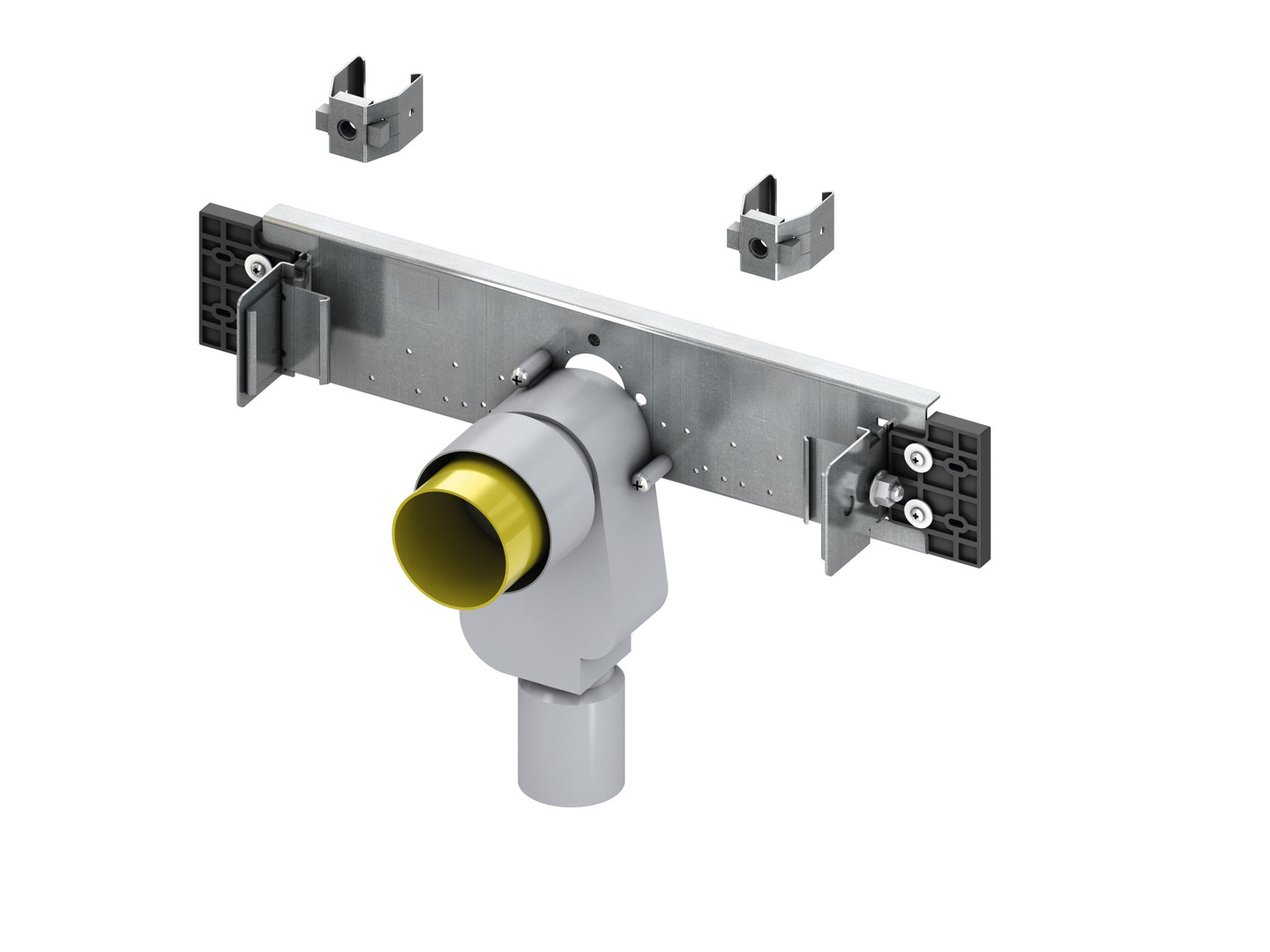 schallentkoppelte Traverse aus verzinktem Stahl, zur bauseitigen Montage von Wandscheiben, mit vormontiertem UP-Geruchsverschluss DN 50, herausnehmbarem Siphon-Einsatz NW 30 (zugleich Dichtung) mit Bauschutzstopfen, Befestigungsmaterial zur Befestigung an TECEprofil Profilrohren, 2 x Befestigungsklammer M 10 und Waschtischbefestigungen