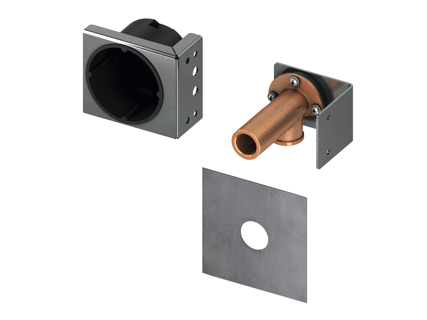 Rohbauset für die Montage an TECEprofil Trockenbaumodulen, geeignet zur Vorrüstung eines Wasser- und Stromanschlusses für Dusch-WC-Aufsätze (z. B. Duravit SensoWash, D-Code und SensoWash Starck, TOTO Washlet Giovannoni/GL 2.0/EK 2.0, Geberit AquaClean 4000/5000/5000plus, V&B viClean U, bestehend aus Hohlwandgerätedose zur seitlichen Montage am Modulrahmen, Wandscheibe 1/2" x 1/2" mit Schallentkopplung, Halteblech für Wandscheibe, Dichtungsmanschette und Befestigungsschrauben