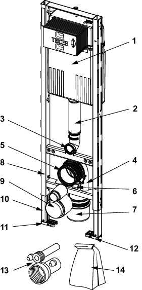 mit easy fit Betätigungsplattenmontage für Befestigung an Profilrohren oder für den Einbau in Metall- oder Holzständerwände und als Vorwand- oder Eckmodul auch für die Einzelblockmontage geeignet, Compact 320-Spülkasten für Betätigung von vorne: Sicherheitstank aus schlagzähem Kunststoff, nach EN 14055 geprüft, Spülkasten komplett vormontiert und versiegelt, Spülkastenanschluss mit Außengewinde R 1/2" oben, kompatibel zu Schnelladaptern, 3-Wege Eckhahn Absperrventil mit Spülfunktion bei montiertem Füllventil, 7 l Tankvolumen 6 l, voreingestellte Standardspülmenge 4,5 l Spülmenge jederzeit einstellbar 3 l Teilmengenspülung bei Zweimengentechnik Einstellung einer 4/2 l Spülmenge optional möglich, Restvolumen zur sofortigen Reinigungsspülung nutzbar, schwitzwasserisoliert, für TECE-Betätigungsplatten und WC-Armatur, als Ein- oder Zweimengenspülkasten einsetzbar, easy fit Betätigungsplattenmontage, Installationstunnel für Serviceöffnung, ohne Werkzeug kürzbar, geräuscharmes hydraulisches Füllventil, Armaturengruppe 1 nach DIN 4109 Modulrahmen: selbsttragend, pulverbeschichtet, zwei Haltebolzen und Muttern M 12, WC-Ablaufbogen DN 90 mit Übergangsadapter DN 90/100 aus PP, Übergangsadapter auch für waagerechten Einbau geeignet, WC-Anschlussgarnitur DN 90, einschließlich Bauschutzstopfen