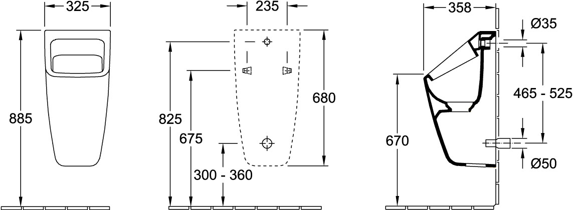 V&B Absaug-Urinal Architectura weiß, vorne gerade, Zu-/Ablauf verdeckt 175224