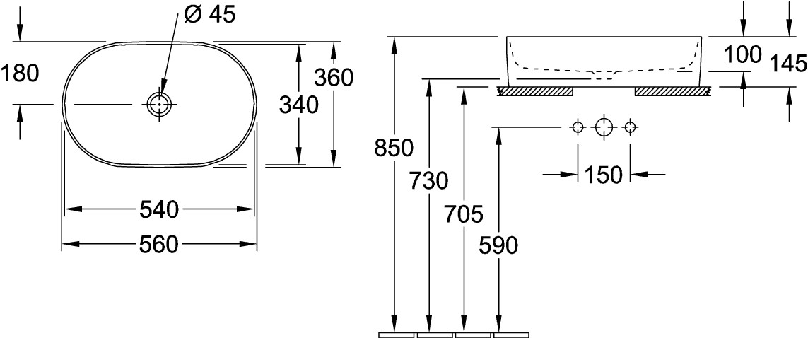 für Wandauslauf-Armatur oder Armatur mit erhöhtem Standfuß, ohne Hahnlochbank