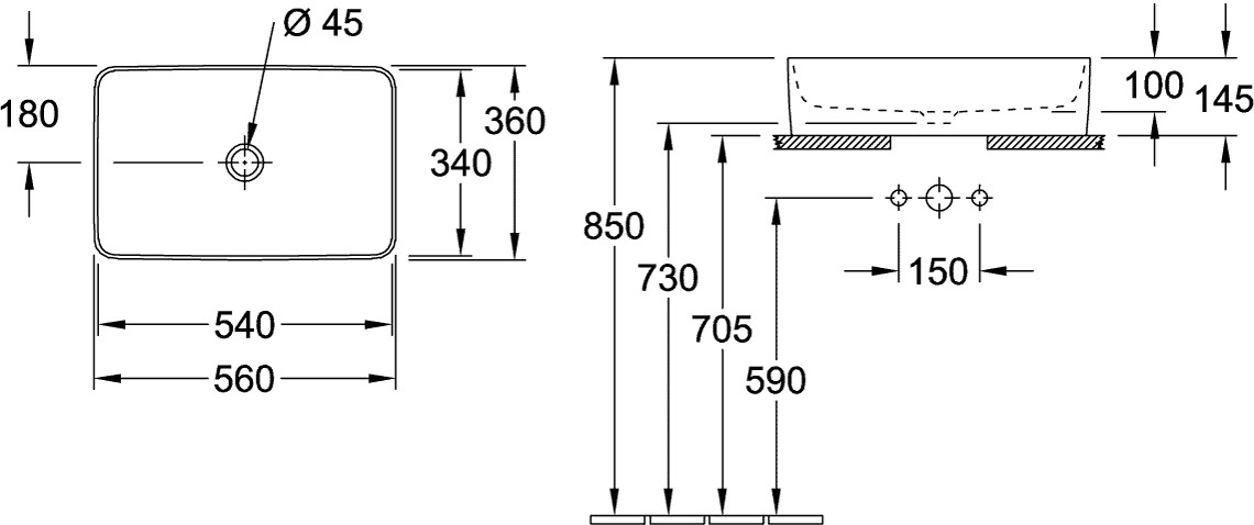 für Wandauslauf-Armatur oder Armatur mit erhöhtem Standfuß, ohne Hahnlochbank