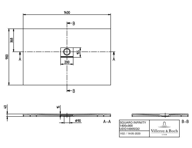 V&B Duschwanne Squaro Infinity 140 x 90 x 4 cm, grey, universal einbaubar, Quaryl