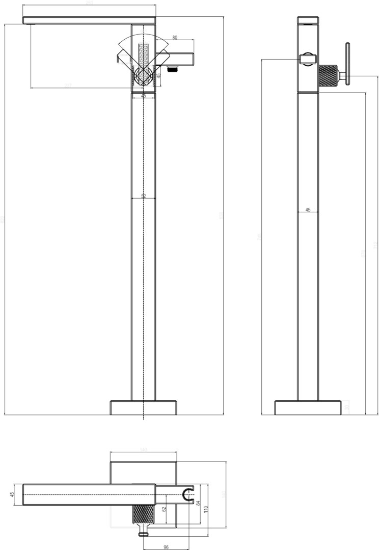 158 x 838 x 280 mm, Eckig, Kippen, Standmontage, Handbrauseschlauch-Anschluss 1/2'', Auslauflänge 237 mm, Auslaufhöhe 822 mm