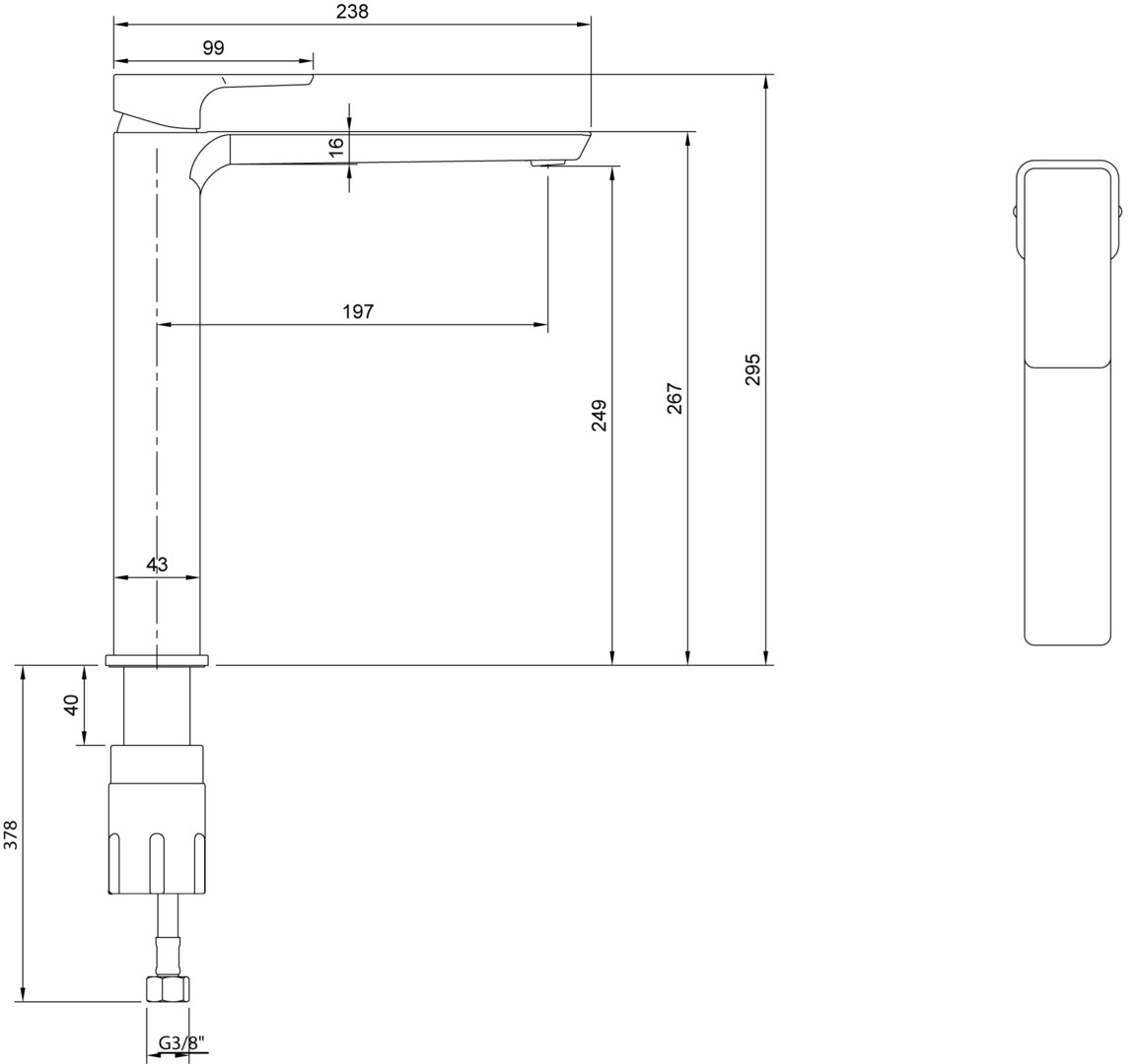 51 x 295 x 238 mm, Eckig, Standmontage, Kippen, Keramikkartusche, Material aus Messing, Standmontage, Anschlusstyp 3/8'', mit verstellbarem Strahlregler, maximale Durchflussmenge bei 3 bar 4,0 l/min, Auslauflänge 134 mm, Auslaufhöhe 110
