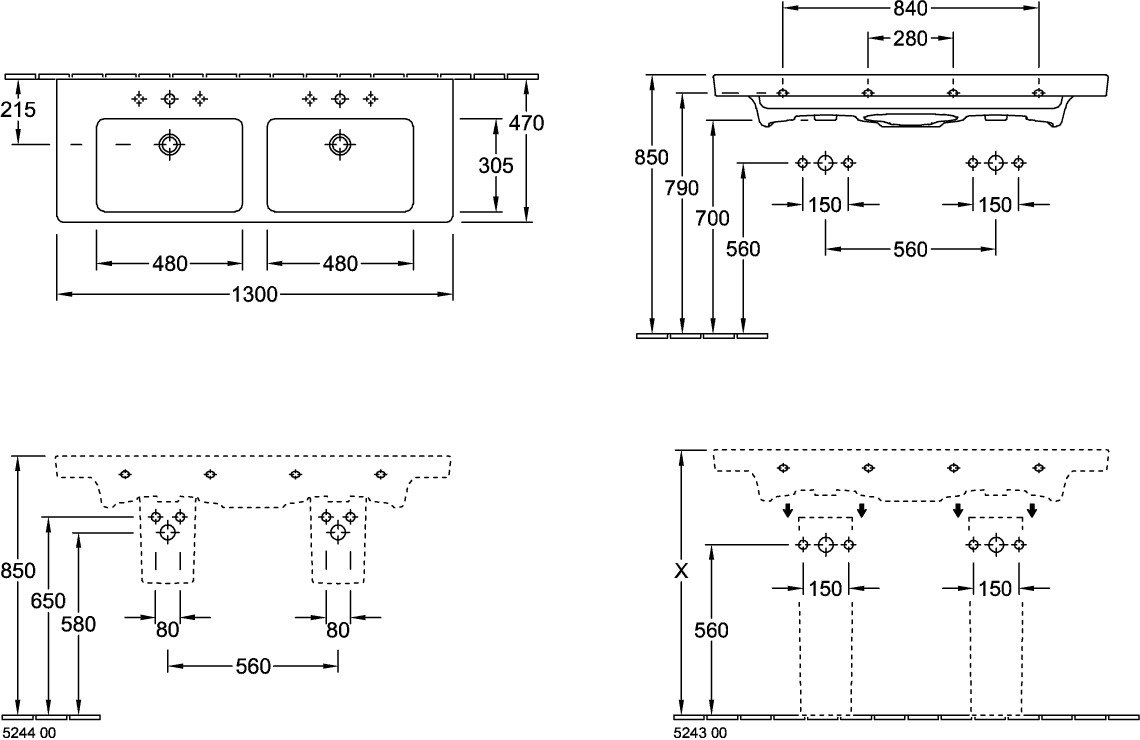 V&B Möbel-Doppelwaschtisch Subway 2.0 130x47cm, 2 Hahnlöcher, Überlauf, weiß