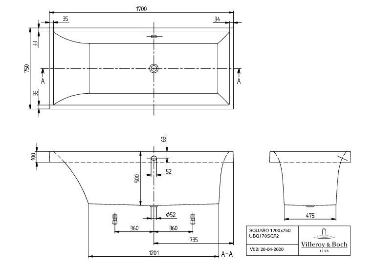 V&B Rechteck-Badewanne Squaro 170 x 75 cm, weiß, Ablauf mittig, Quaryl K20738706
