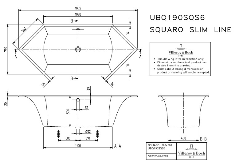 V&B Sechseck-Badewanne Squaro Duo Slim Line 189,2x79,4cm, Quaryl, weiß