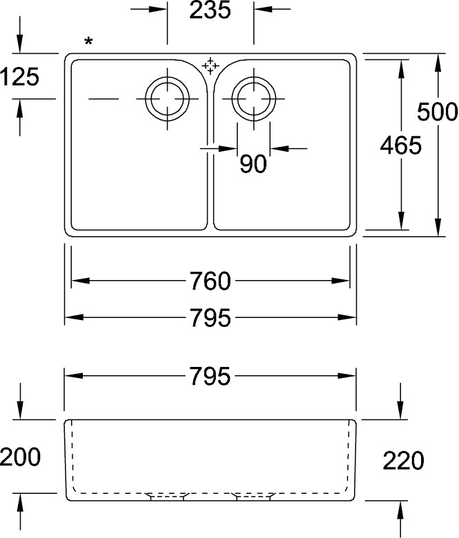 Montage auf einem Unterschrank, Einbau in Natur-/Kunststeinplatten empfohlen, minimale Unterschrankbreite 80 cm, 2 Becken verschließbar
