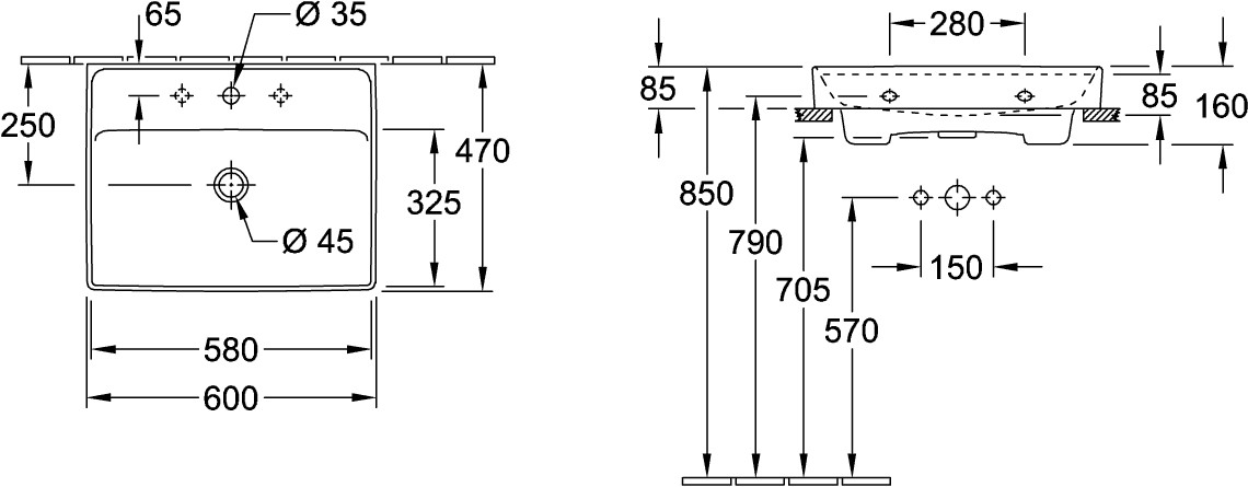 für 3-Loch Armatur geeignet, mittleres Hahnloch durchgestochen, mit Wandbefestigung