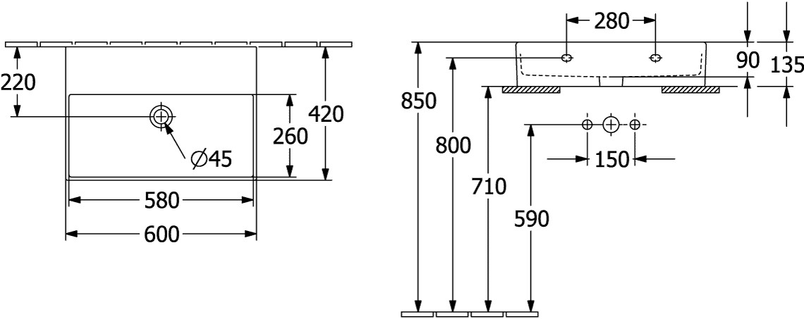 Rechteck, Unterseite geschliffen, ohne Hahnloch, beim Einsatz einer Wandauslaufarmatur empfehlen wir eine Ausladung von mindestens 205 mm, ohne Überlauf, bei Modellen ohne Überlauffunktion muss ein nicht verschließbares Ventil oder ViFlow (verdeckter Überlauf) verwendet werden, EN 31, EN 14688, mit Ausschnittschablone
