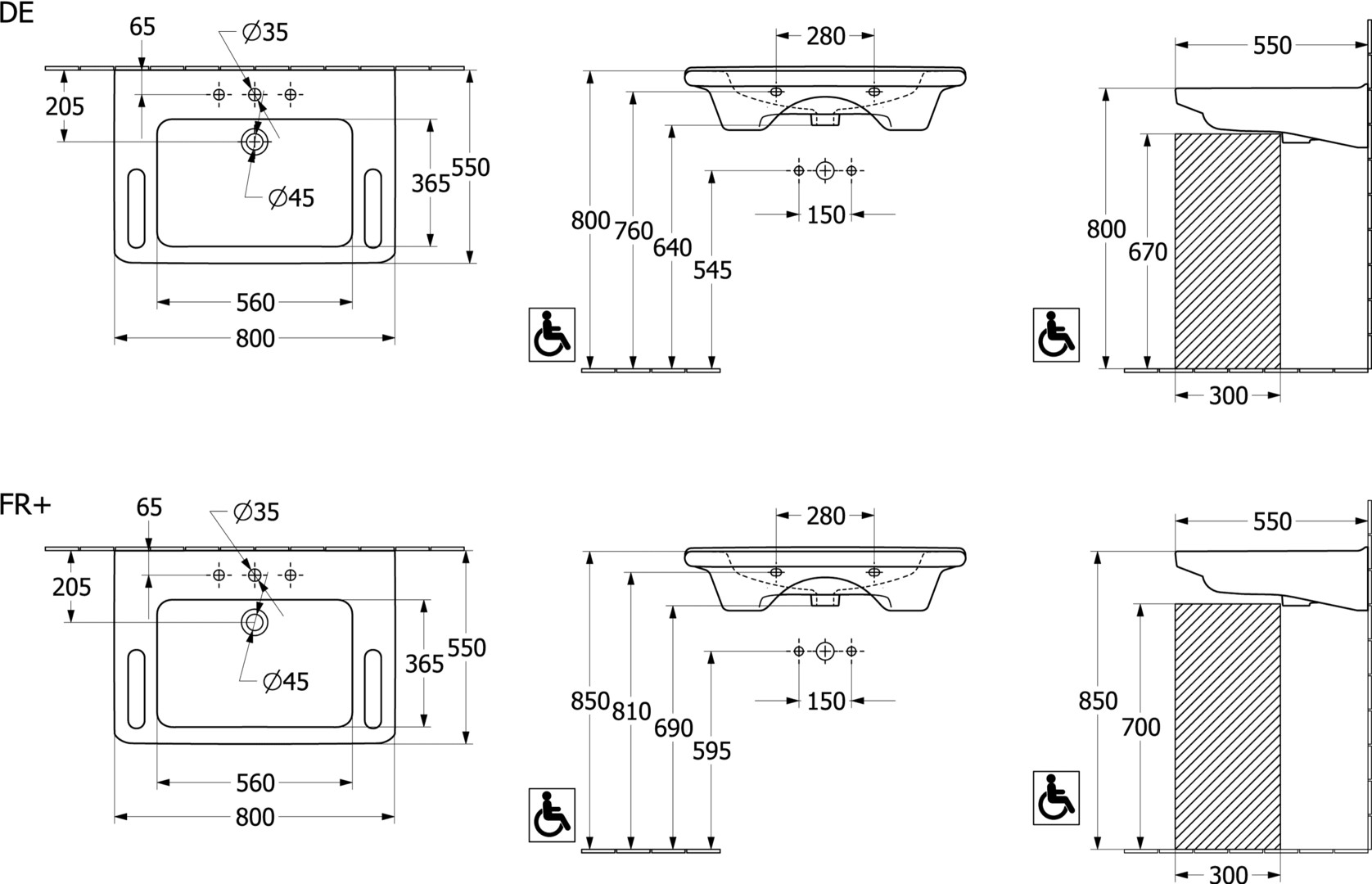 Rechteck, für 3-Loch Armatur geeignet, mittleres Hahnloch unterfahrbar, DIN 18040, EN 31, EN 14688, gemäß den Anforderungen der DIN 18040