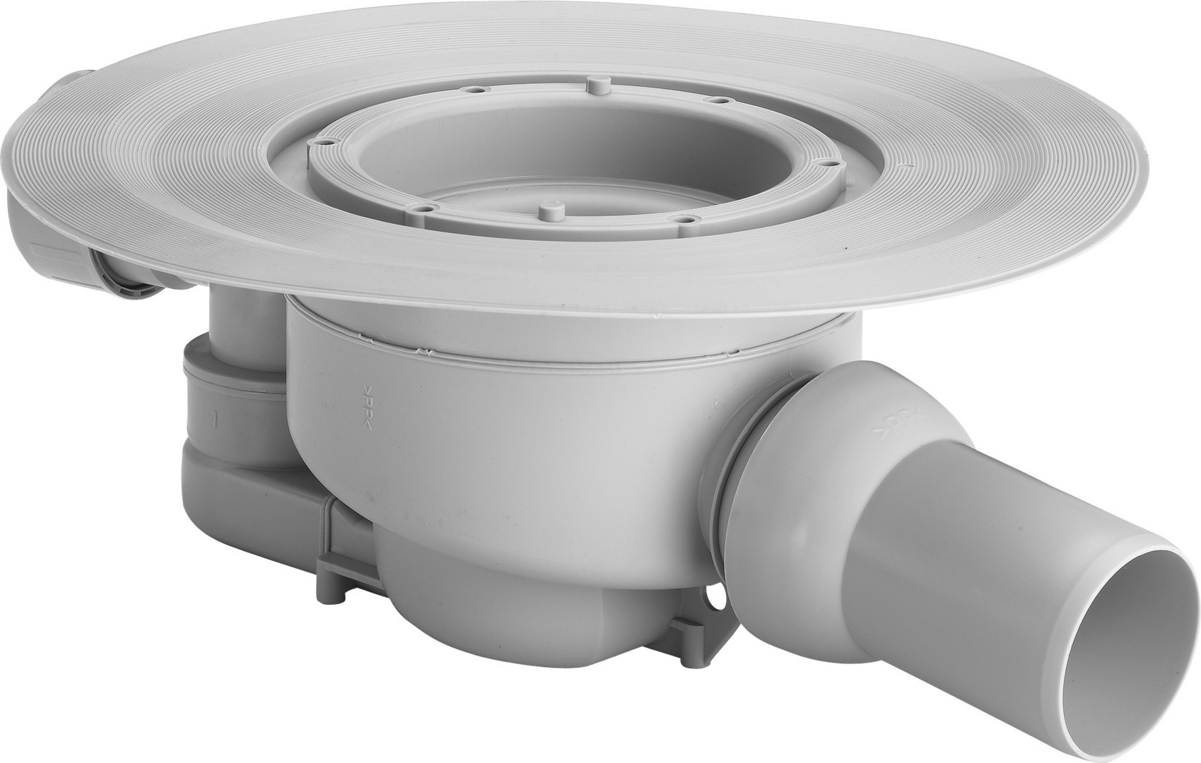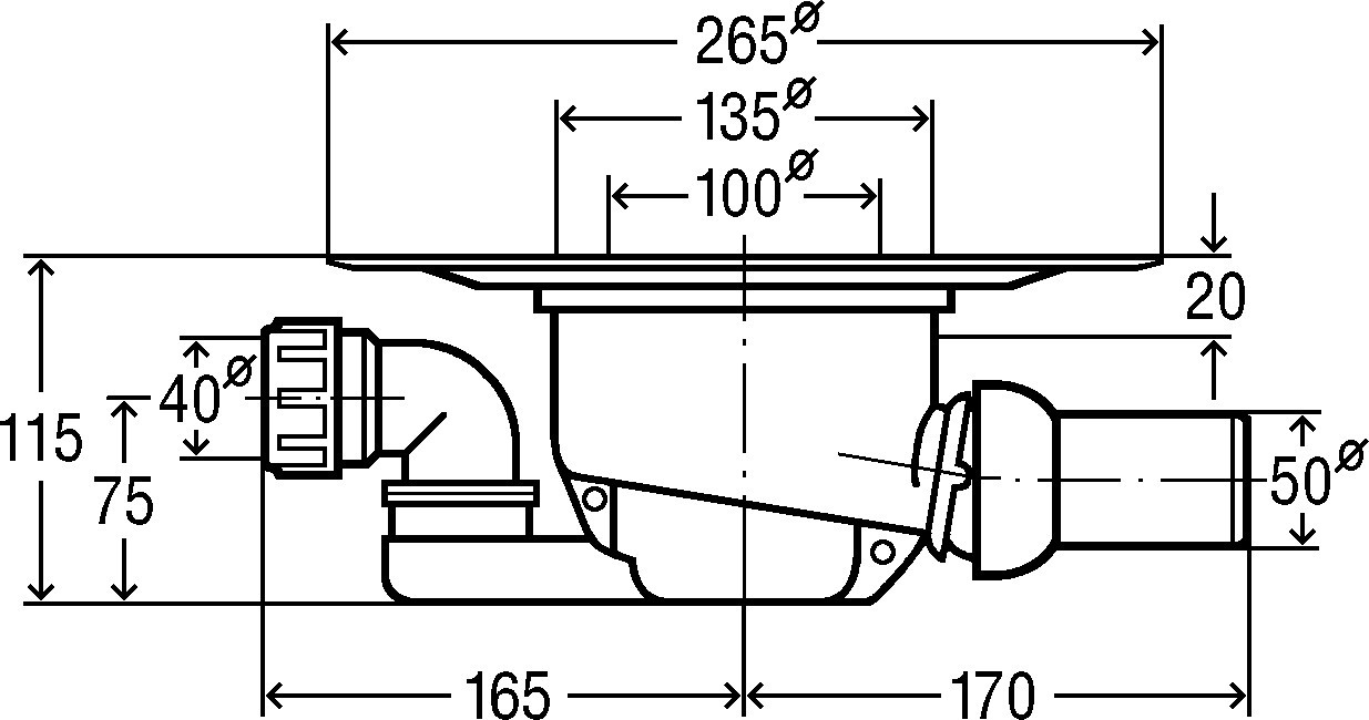 Systemmaß 100, bestehend aus Stopfen, Abdichtungsflansch, Geruchverschluss herausnehmbar, Zulauf DN40 drehbar, Ablaufrohr mit Kugelgelenk, Ablaufleistung Anstauhöhe 10 mm 0,66 l/s, Ablaufleistung Anstauhöhe 20 mm 1,1 l/s, Ablaufleistung Zulauf 1,2 l/s, güteüberwacht nach DIN EN 1253