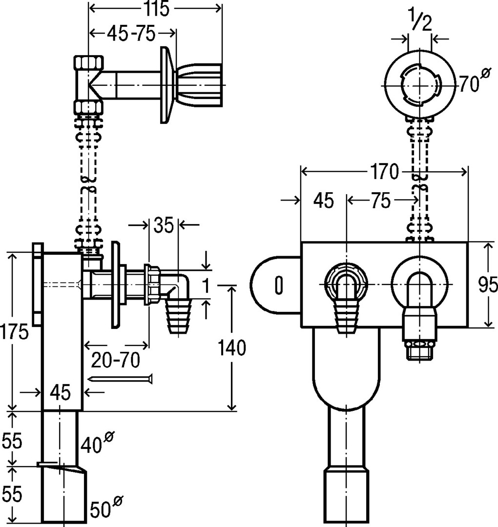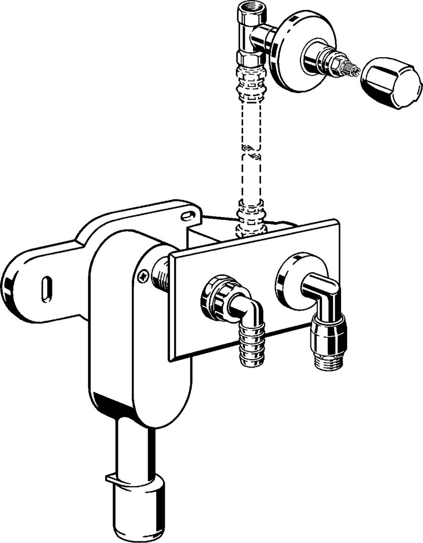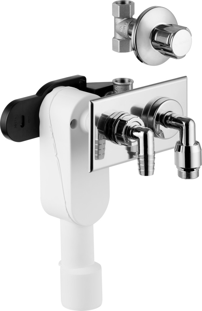 für Wandeinbau, für den Abwasserschlauch einer Wasch- oder Geschirrspülmaschine, mit integrierter Wasserversorgung, Anschlussbogen mit Rückflussverhinderer und Rohrbelüfter, mit Montageschiene, Abdeckplatte aus Edelstahl, Schlauchverschraubung 90° verchromt, güteüberwacht nach DIN 19541