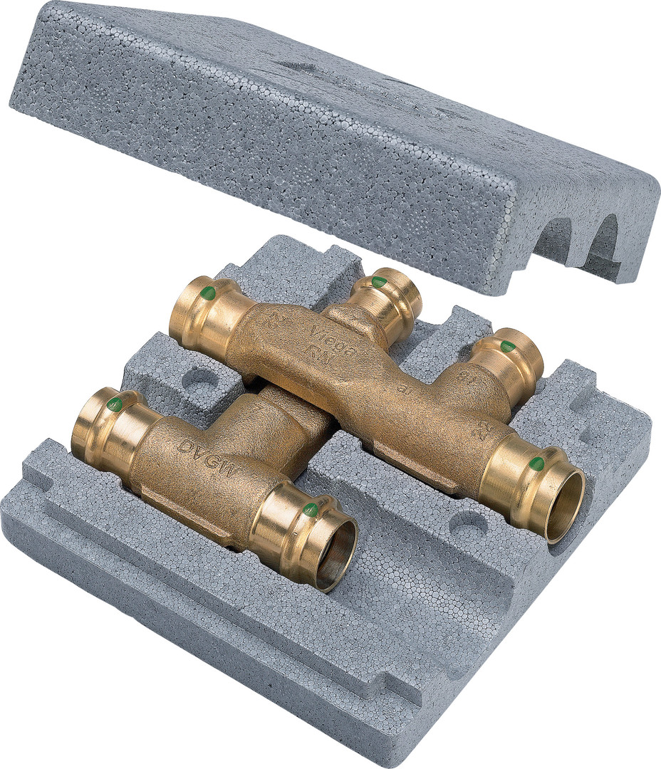 zum Kreuzen von Leitungen unter Beibehaltung der entsprechenden Aufbauhöhen, Pressanschlüsse, mit Dämmbox, Höhe 50 mm, Länge 160 mm, Breite 160 mm