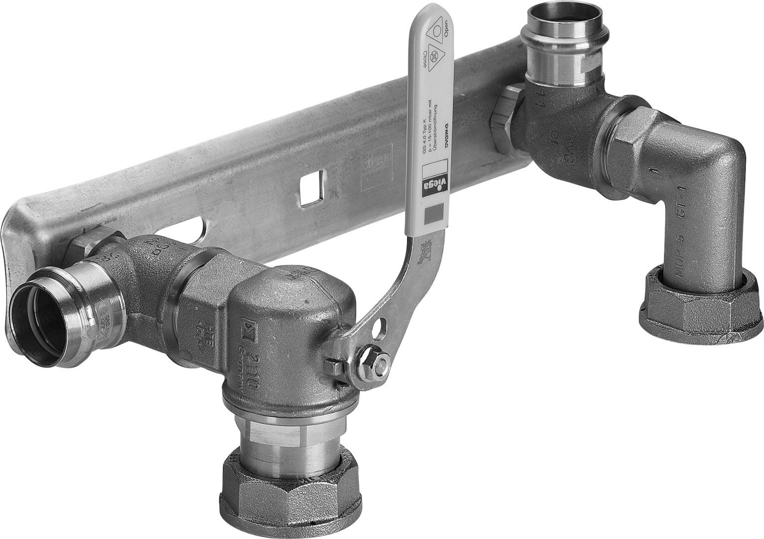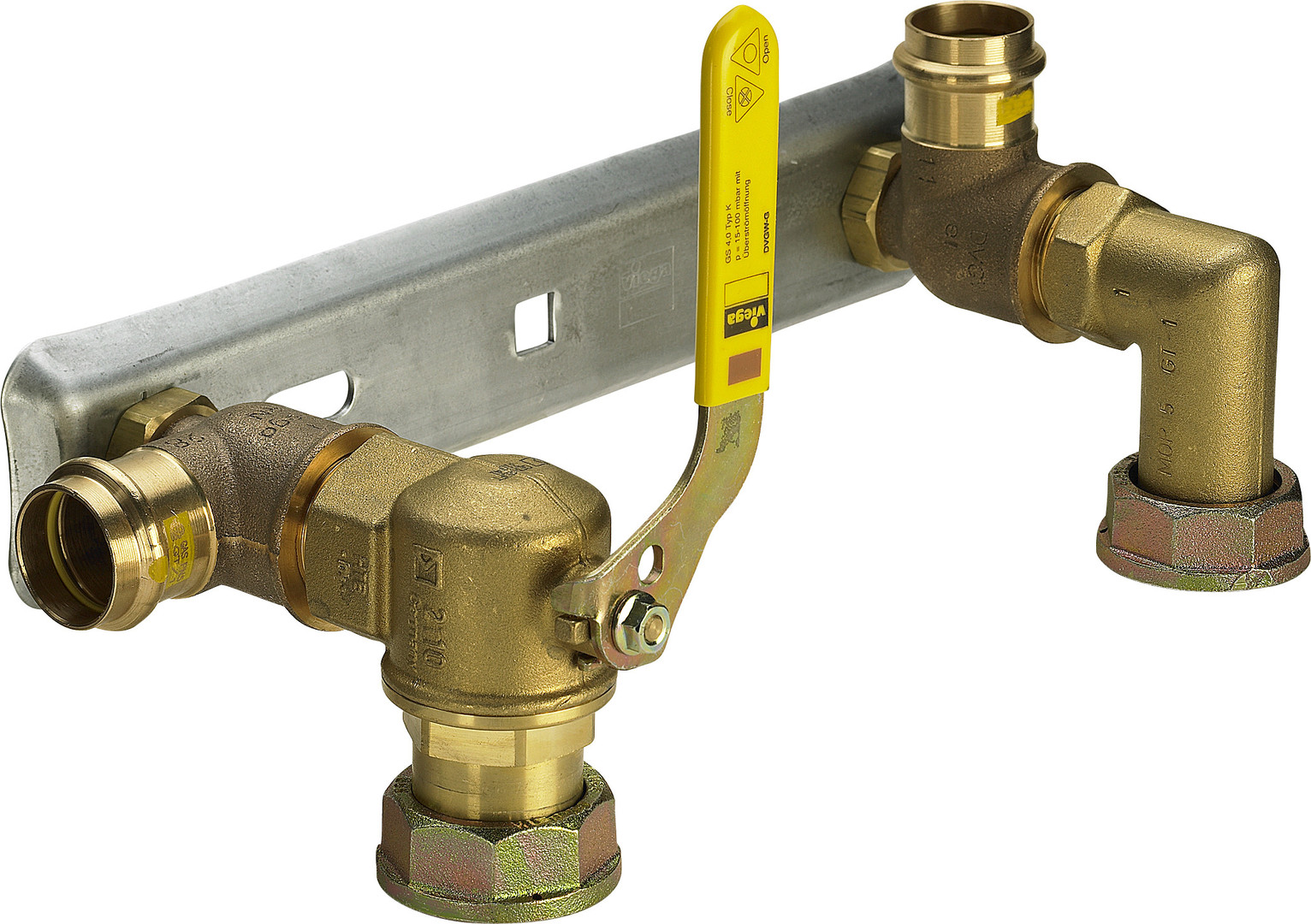 für Zweistutzengaszähler, Eingang/Ausgang Profipress G-Winkel aus Rotguss, abschließbar, plombierbar, mit integrierter Zählerverschraubung, Kugeleckhahn, Anschlusswinkel 90°, Wandhalterung, Dichtelemente HNBR, Umgebungstemperatur max. 70 °C, Betriebsdruck max. 0,5 MPa (MOP 5), höher thermisch belastbar, 650 °C/30 min GT1