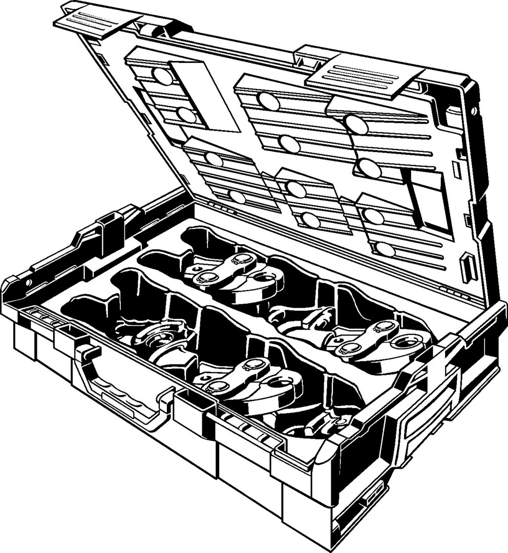 für Sanfix Fosta und Fonterra, empfohlen für Pressgun 6 Plus, Pressgun 6, Pressgun 6B, Pressgun 5, Pressgun 4B und 4E, Pressmaschinen PT3-H/EH, PT3-AH und Typ 2 (PT2), Akku-Pressmaschinen des Herstellers Holger Clasen, Geberit/Mepla-Pressmaschinen Typ PWH 75, Typ N 230 V und Typ N Akku, Geberit/Mapress-Pressmaschinen Typ EFPII, ACO 1, ECO 1, ACO 201, ECO 201, AFP 201, EFP 201, ACO 202 und ECO 202, Ridgid-Pressmaschinen RP 10-S, RP 10-B, RP 330C/330B, RP 340, mit Systemkoffer, Koffereinsatz PT2-Pressbacken, Deckeleinlage, Pressbacke PT2