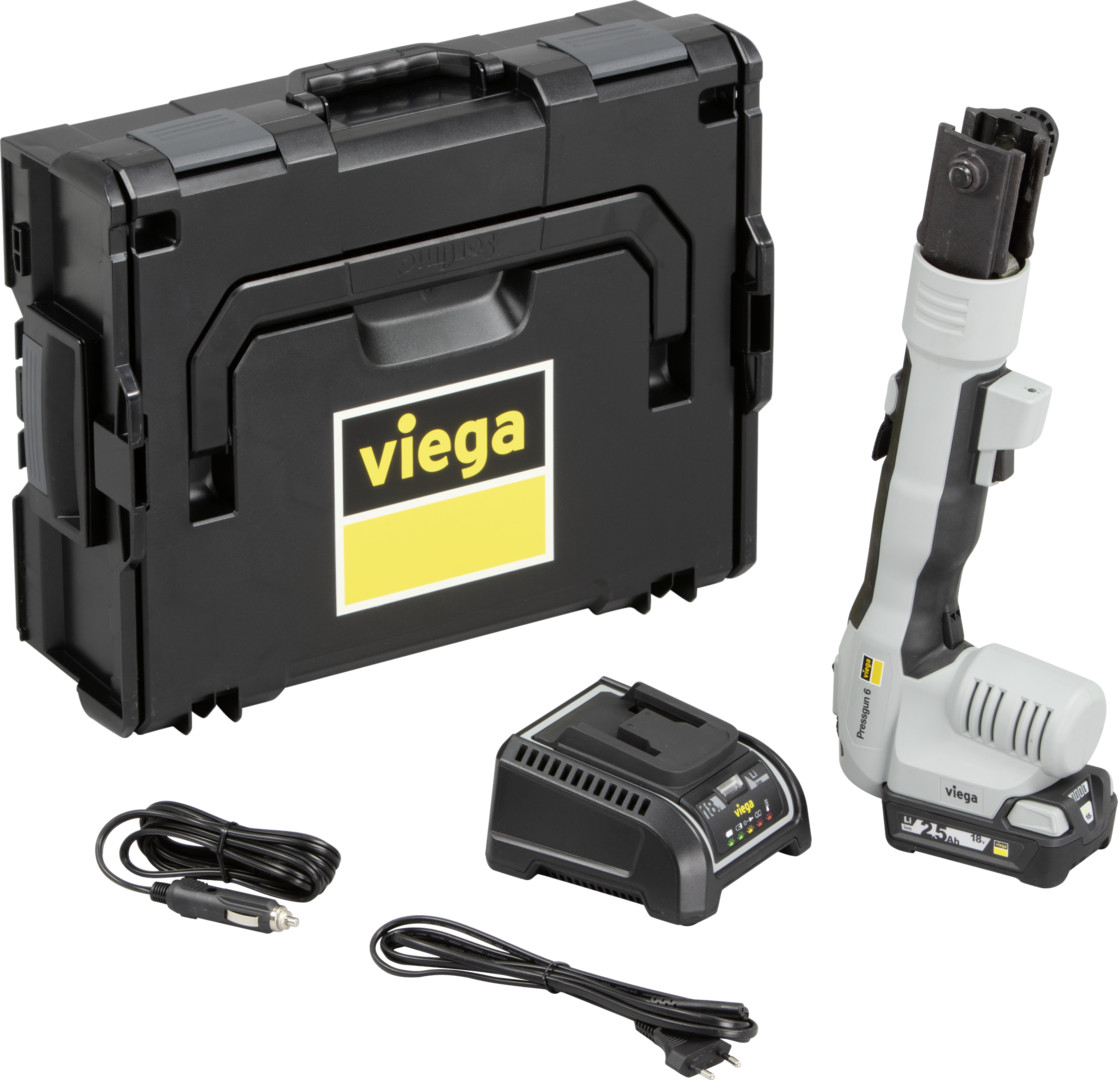 für Systempressbacken/-ringe/-ketten und (Gelenk-) Zugbacken mit PT2-Schnittstelle, nicht geeignet für Pressgun-Press Booster, ausgestattet mit Systemkoffer, Koffereinsatz Pressgun 6 Pressgun Picco 6, Deckeleinlage, Akku-Ladegerät für Viega 18 V-Lithium-Ionen-Akkus, Anschlusskabel Typ C (CEE7/16)/C7, Anschlusskabel 12 V-Bordspannungsstecker SAE J563, Akku, Pressbackenaufnahme um 270° drehbar, Pressbackenverriegelung mechanisch, Betriebszustands- und Presszyklenanzeige über Display, Ausstattung mit Akku 18 V/2,5 Ah, Akku-Ladegerät 110–250 V/50–60 Hz/12 V, Presskraft 32 kN