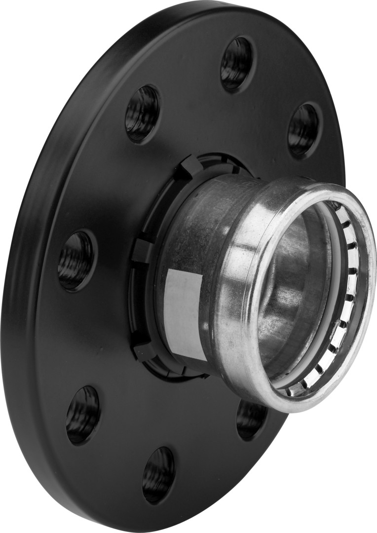 mit losem Flansch PN 10/16, aus Stahl schwarz pulverbeschichtet, Pressanschluss, Flanschübergang, mit Dichtelement HNBR, Schneidring und Trennring