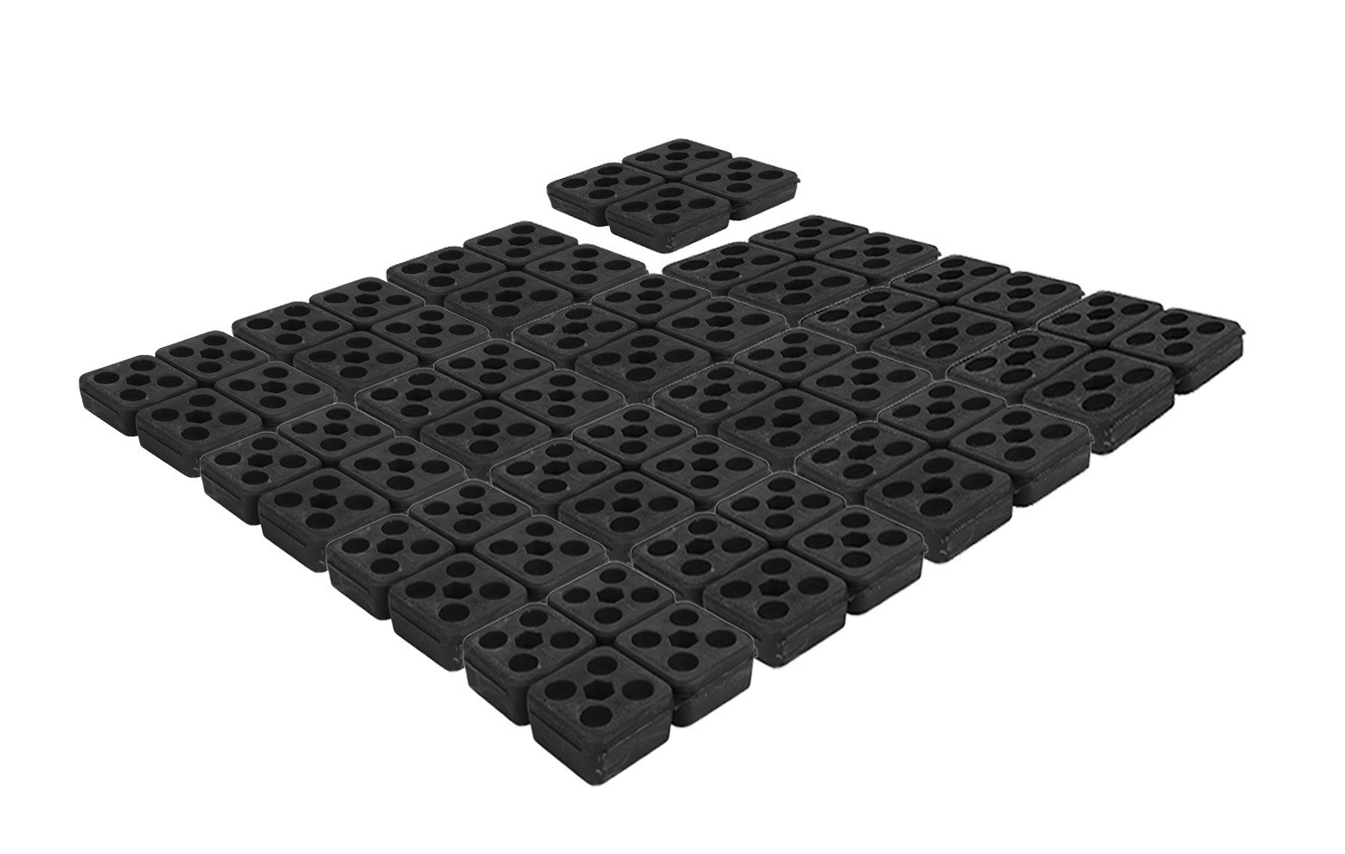 ideal als elastische und dämpfende Grundplatte für Geräte und Metallelemente geeignet, einzelne 50x50mm Stücke können leicht zugeschnitten werden, verwandelt sich in eine elastische Grundplatte, bei Verwendung mit Sechskantschrauben, Wiederverwendbarkeit im Falle eines Maschinenumzugs, hardness 45 shore A, Gebrauchstemperatur: -20° C bis 90° C, einfach zu schneiden und zu montieren, Lieferung als Matte mit 64 Einzelblöcken (8x8) verbunden durch eine Membrane