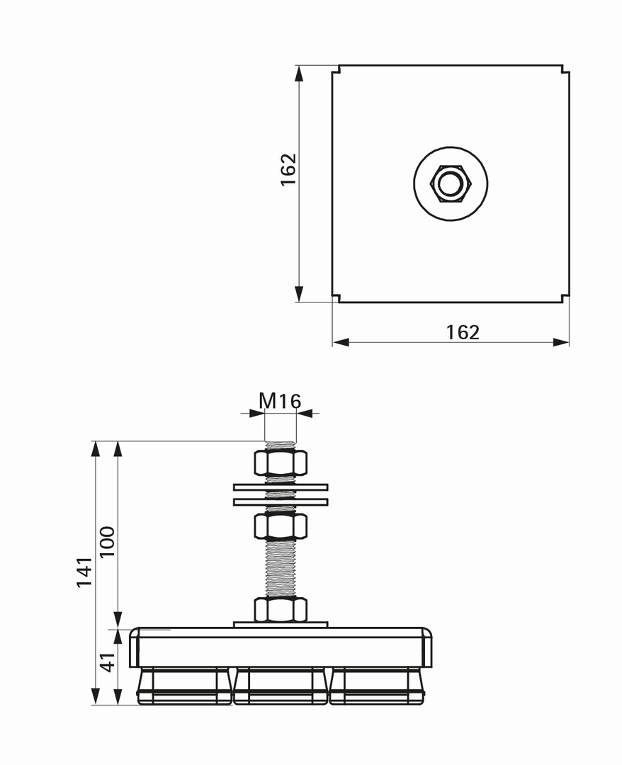 Maschinenfuß (Gummi) mit M16-Anschluss zur Geräteabkopplung und Nivellierung, empfohlen für Maschinen mit Arbeitsgeschwindigkeiten über 2.500 U/min, bietet einen Schwingungsdämpfungsgrad von 75% bis 80%, einfach zu installieren, muss nicht an tragenden Strukturen befestigt werden, Gummidämpfer mit DIN 934-Muttern und DIN 9012-Unterlegscheiben im Lieferumfang enthalten für Montage- und Nivelliereinrichtungen, Gebrauchstemperatur: -20° C bis 90° C, Metall- und Gummiteile können zur Entsorgung getrennt werden, hardness 45 shore A