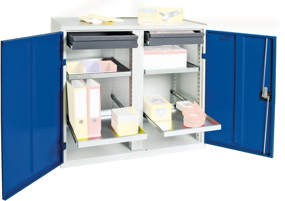 Werkzeugschrank B1000xT500xH1000 mm RAL 7035/5010 2 Schubladen, 4 Wannen