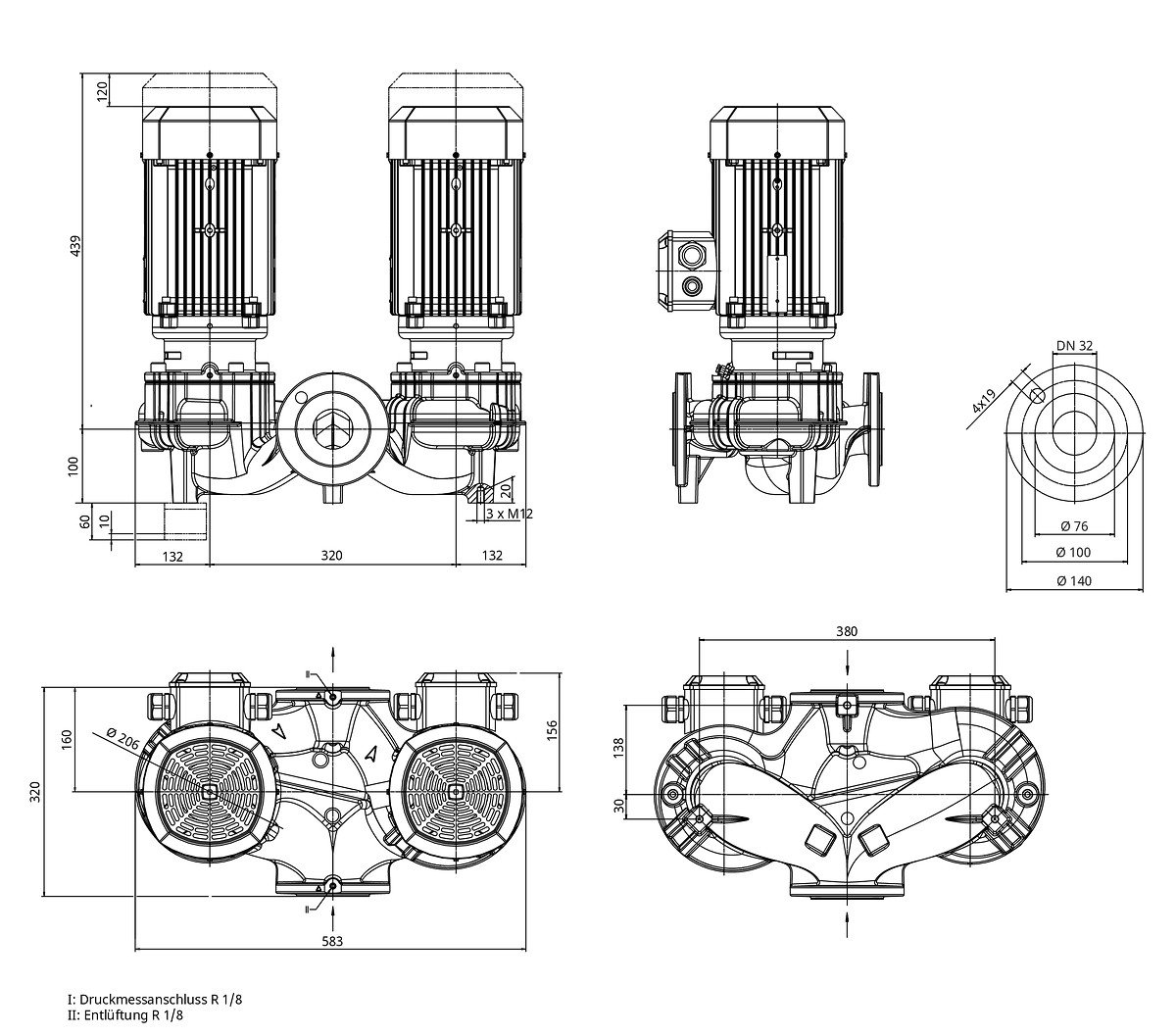 Wilo Trockenläufer-Standard-Doppelpumpe VeroTwin-DPL32/165-4/2-S1, DN32 (PN 16), 4.0kW
