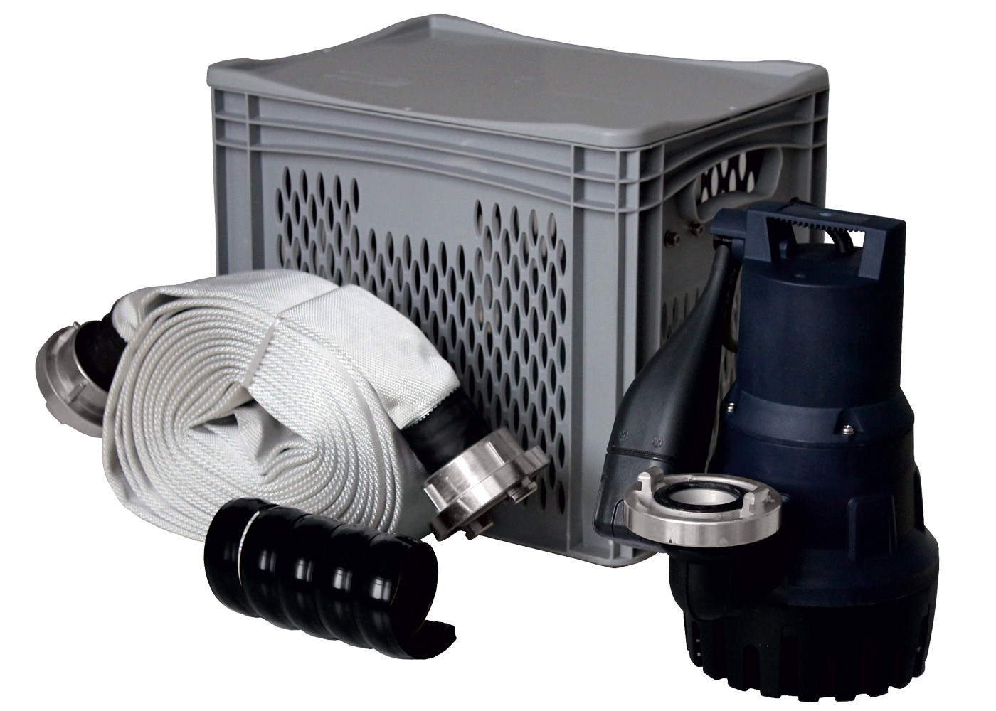 aus korrosionsbeständigem, schlagfestem Kunststoff und Edelstahl, Motorwicklung mit eingebautem thermischen Wicklungsschutz, Abdichtung durch dreifachen Wellendichtring, integrierte Entlüftungsschraube, horizontaler Druckabgang 1 1/4" AG, Automatikbetrieb durch Hebel-Schwimmerschalter, Flachsaugfunktion durch abnehmbares Sieb, 15 m C-Schlauch mit Kupplungen Storz C, Einklemm- und Knickschutz aus Kunststoff für den Schlauch, Transportbox 40 x 33,3 x 30 cm (fungiert gleichzeitig als Schutzkorb), Dauerbetrieb durch mitgelieferte Arretierung möglich, mit 10 m Anschlusskabel und Schutzkontaktstecker, Rückschlagklappe, Anschlussbogen 90° 1 1/4" IG, Komplettset zur Notentwässerung, zum Beseitigen von (eindringendem) Grund und Hochwasser, Pumpe kann leicht aus der Box entnommen und auch außerhalb der Box verwendet werden, 2,3 A, 50 Hz, IP 68, Eintauchtiefe 7 m, Förderhöhe max. 9 m, Fördermenge max. 11 cbm/h, Korngröße 20 mm, Medientemperatur max. 35 °C, Einschaltwasserstand min. 250 mm, Ausschaltwasserstand min 150 mm